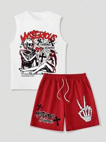 Street Life Men's Casual Skeleton Cross Spider Print Slogan Tank Top And Shorts Set, Summer