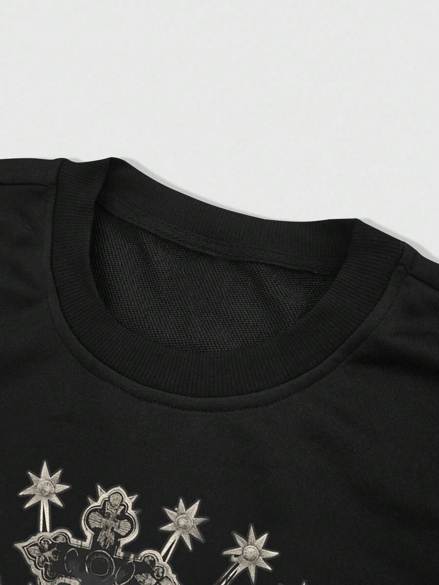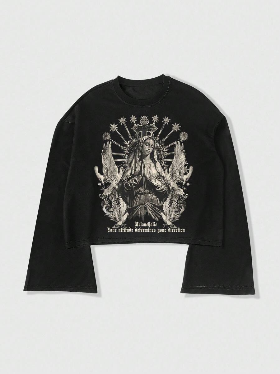 Street Life Men's Casual Slogan Virgin Mary Print Round Neck Long Sleeve Loose T-Shirt, Autumn