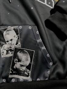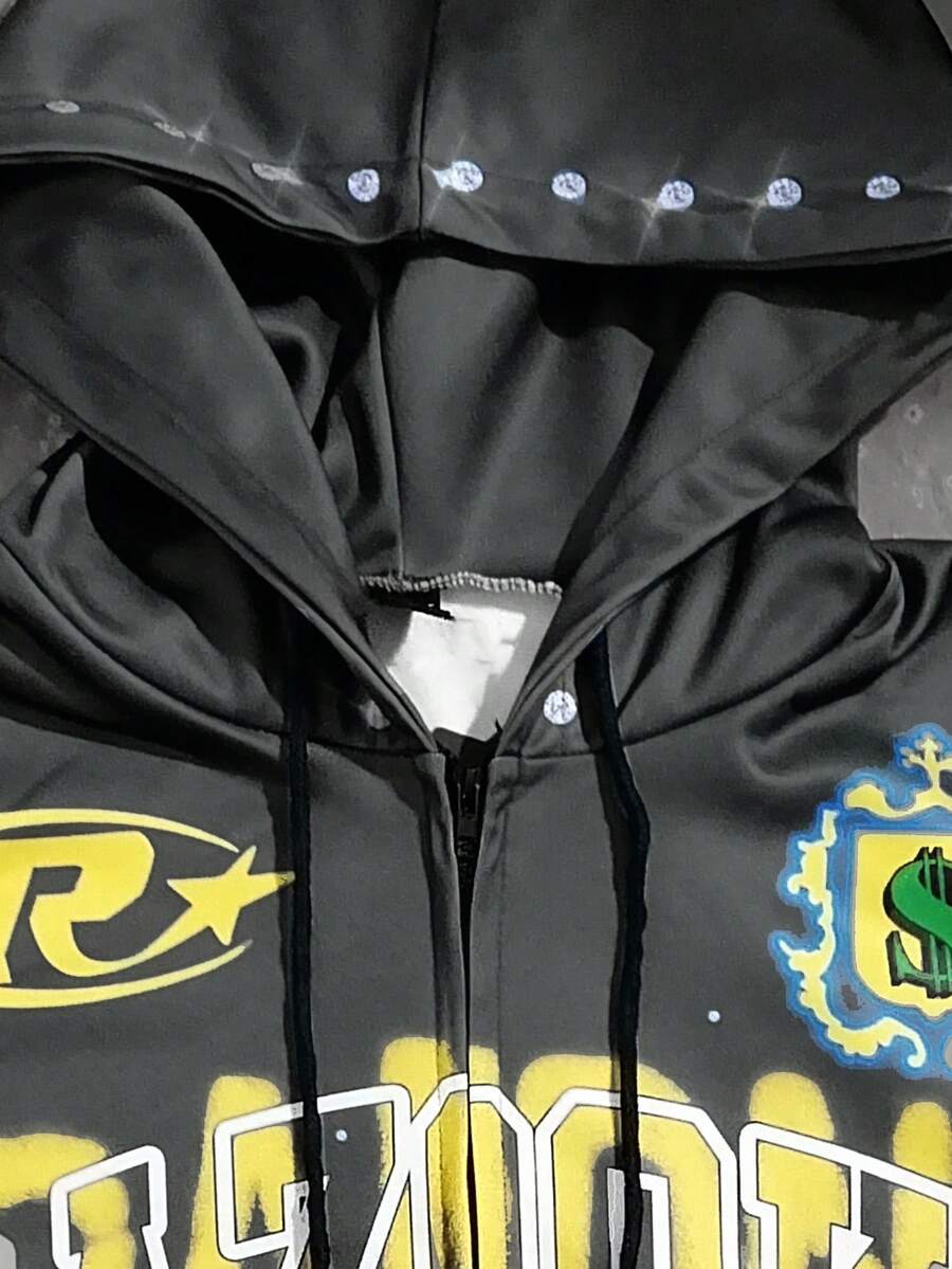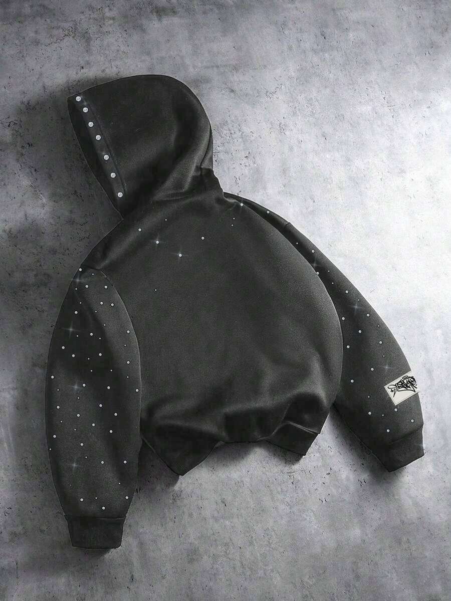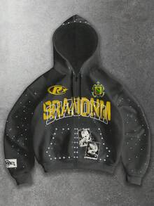 Street Life Men's Casual Streetwear Hoodie With Letter & Figure Rhinestone Print, Zipper Front, Drawstring