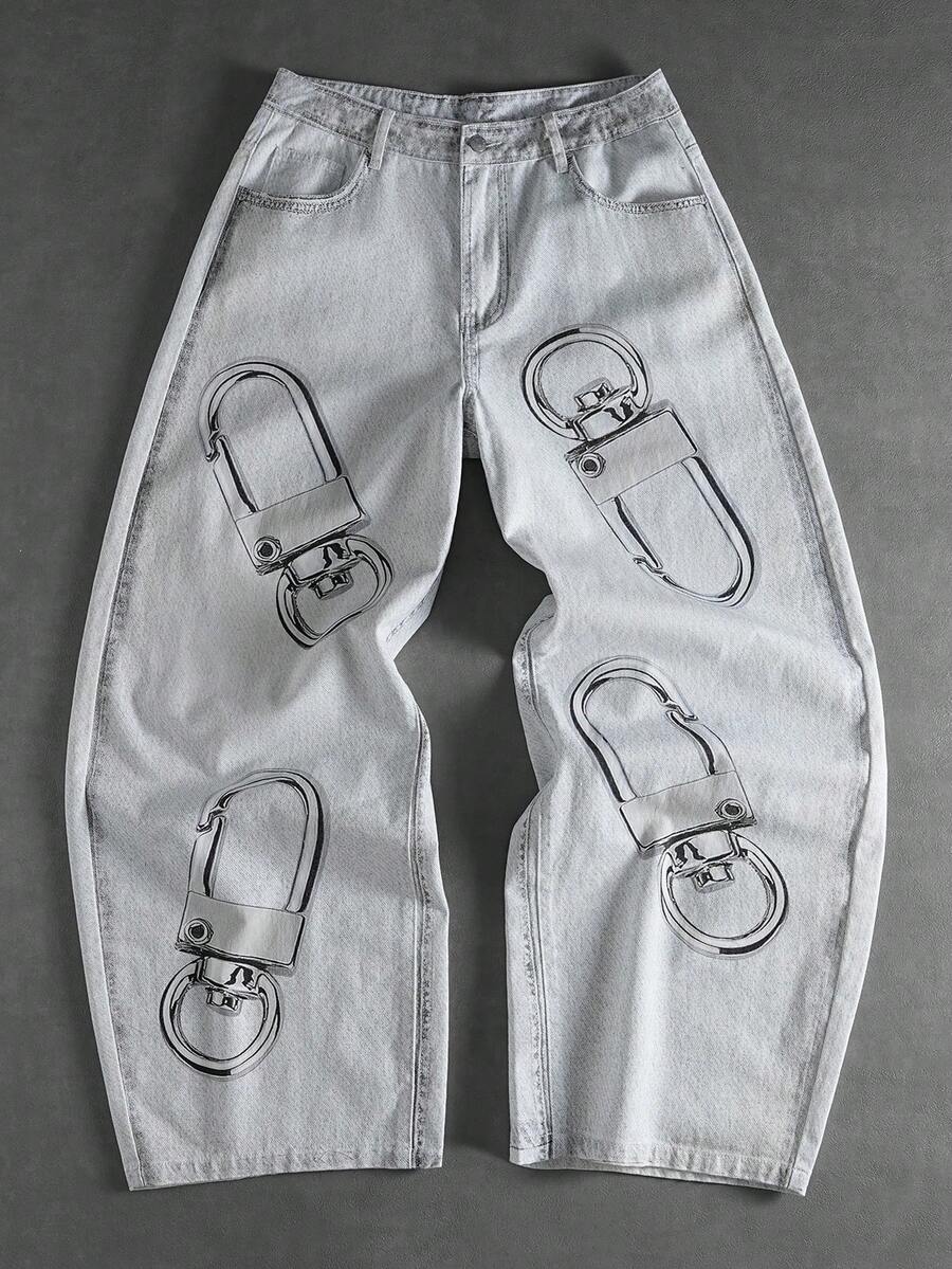 Street Life Men's Casual Washed Digital Print Curved Knife Denim Jeans