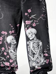 Street Life Men's Digital Print Skull & Sakura Flower Samurai Sword Graphic Jeans
