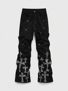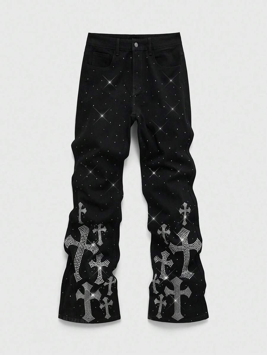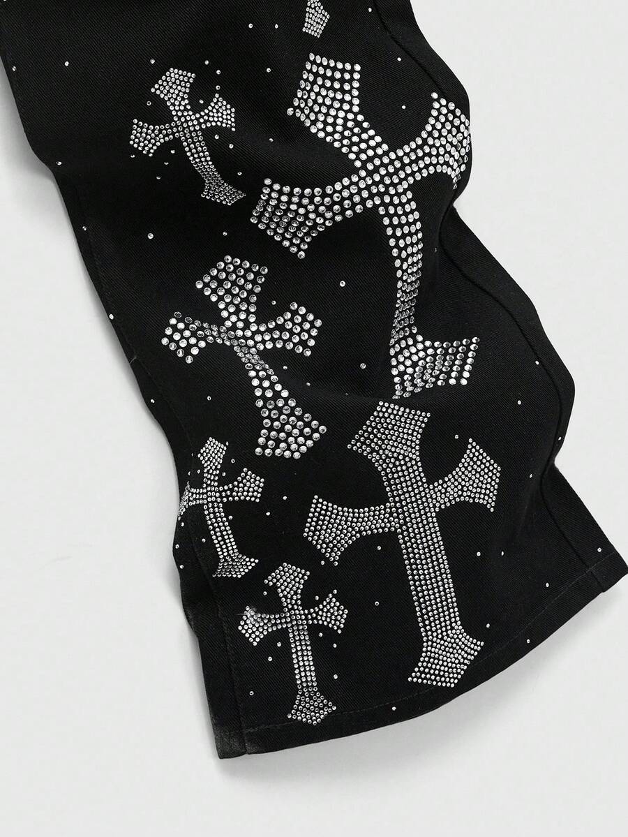 Street Life Men's Fashion Street Style Rhinestone Cross Graphic Slant Pocket Denim Jeans