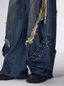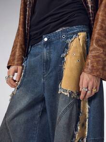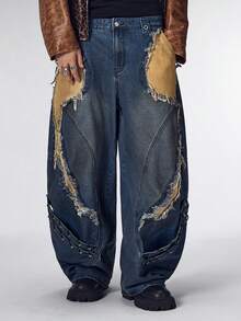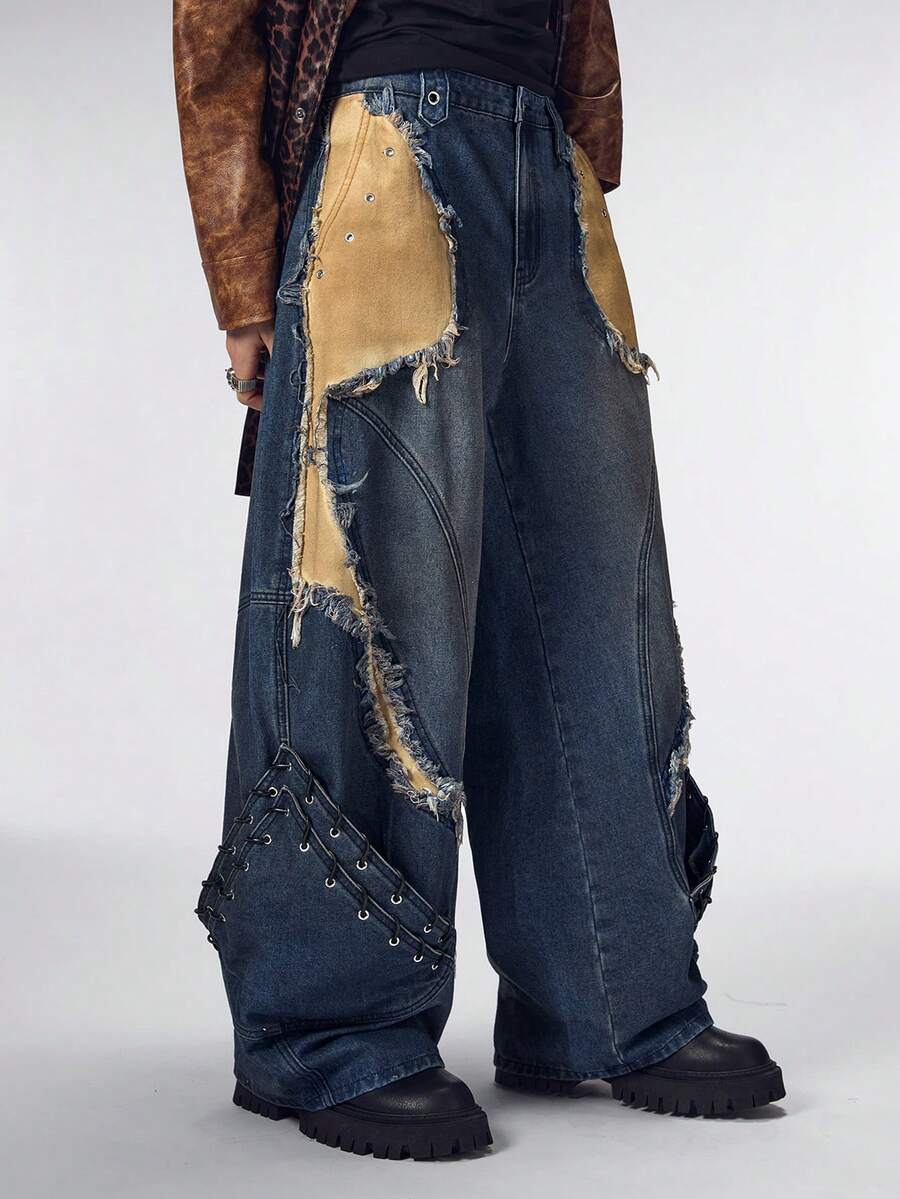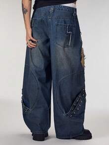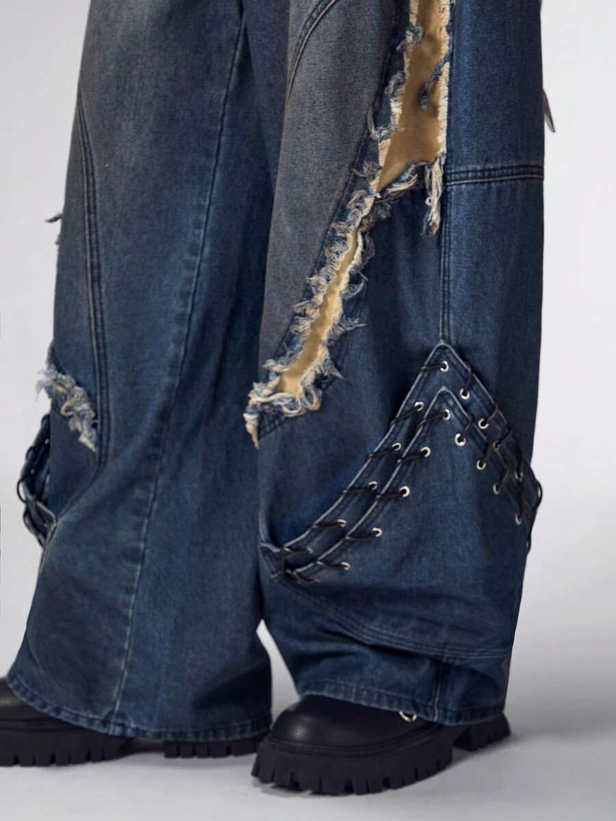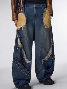Street Life Men's Heavy-Duty Punk Patchwork Dark Blue Curved Knife Jeans