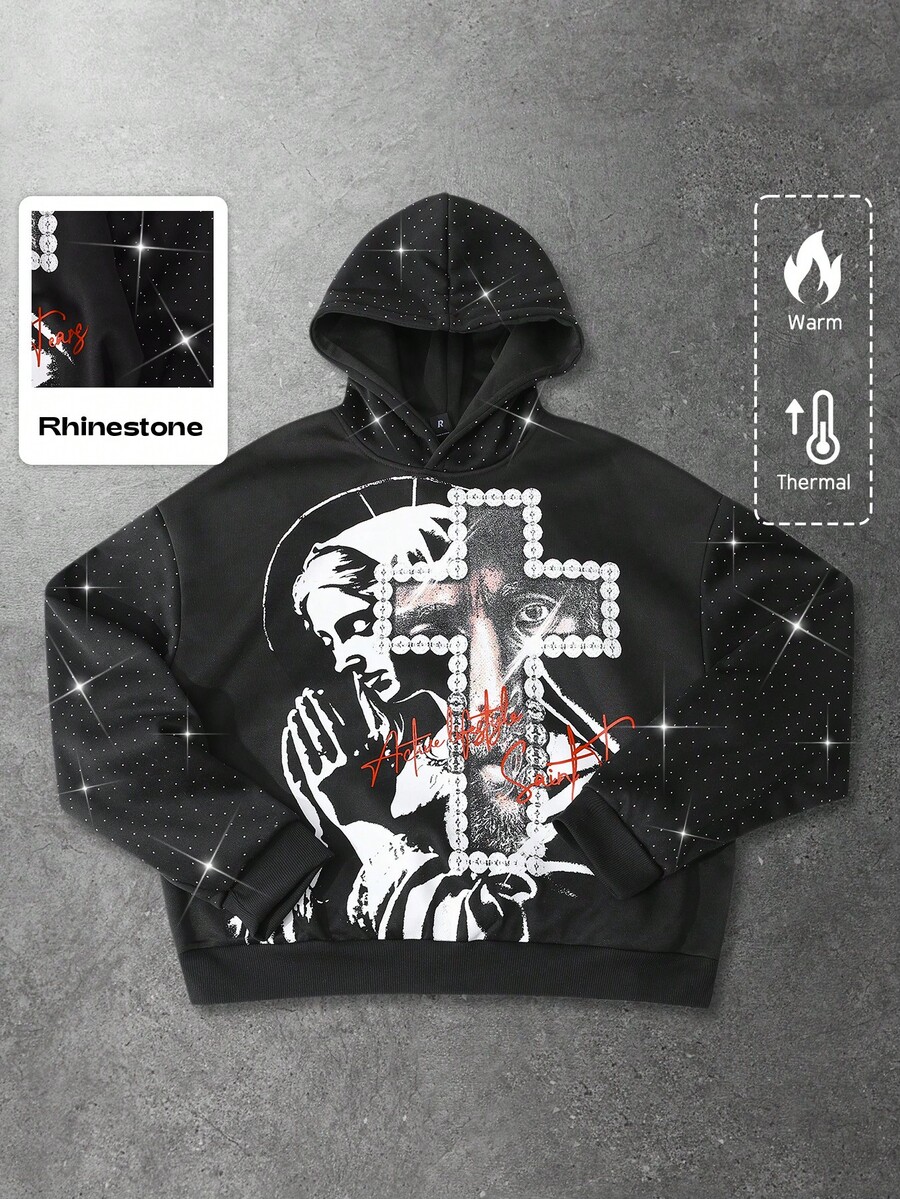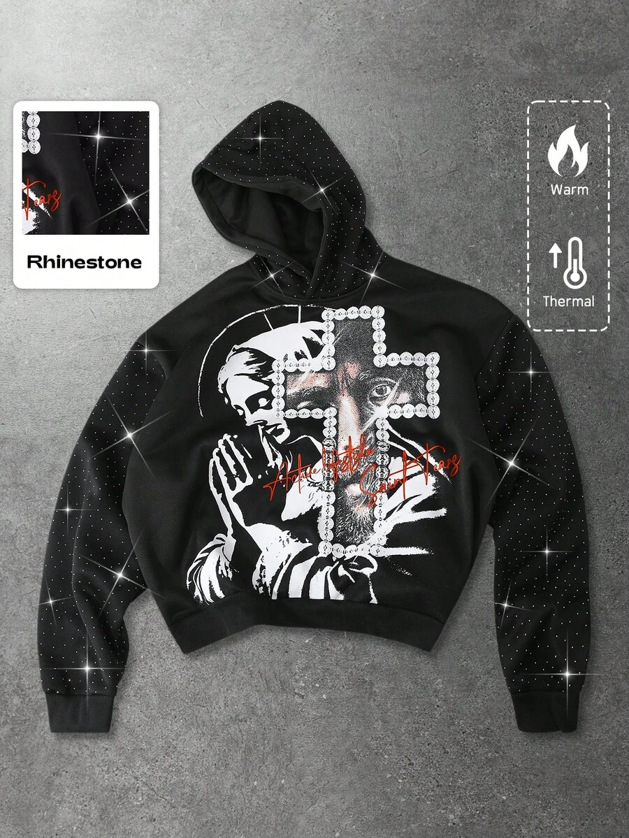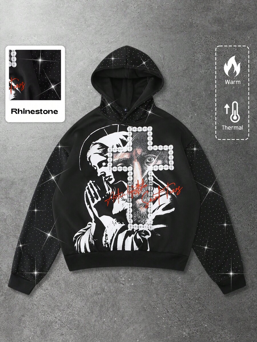 Street Life Men's Hooded Sweatshirt, Jesus, Virgin Mary, Cross, English Text Print, Rhinestone Patchwork, Autumn/Winter