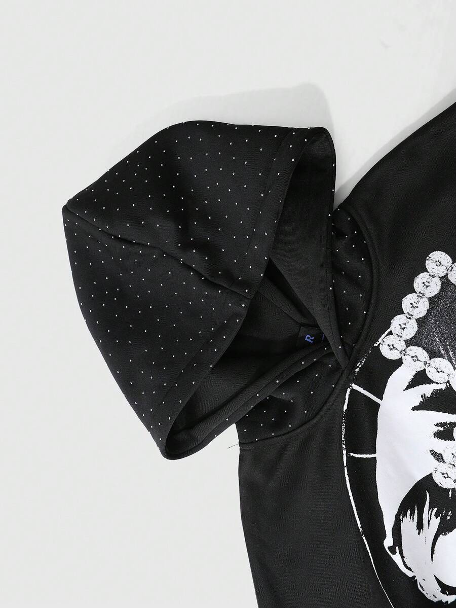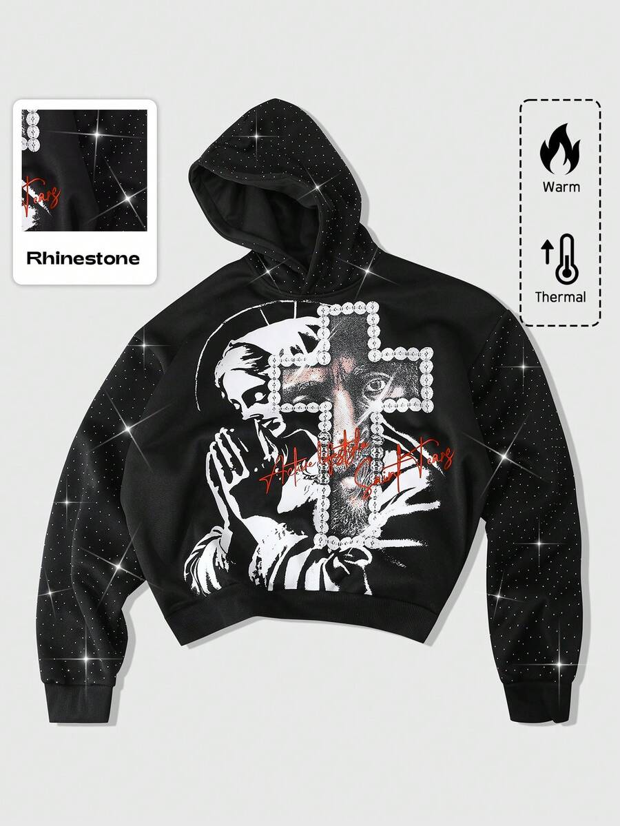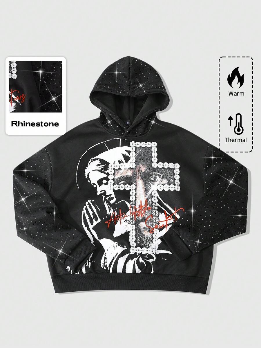 Street Life Men's Hooded Sweatshirt, Jesus, Virgin Mary, Cross, English Text Print, Rhinestone Patchwork, Autumn/Winter