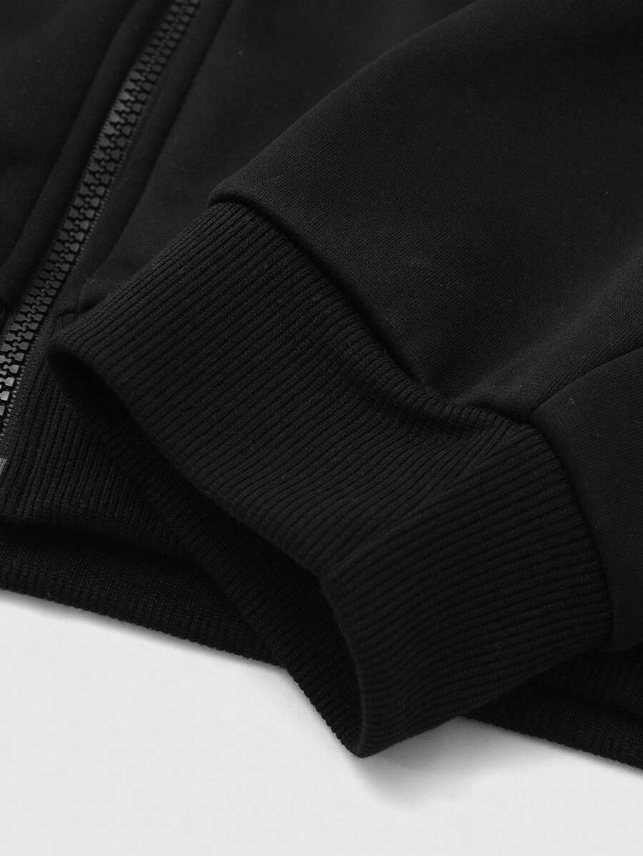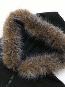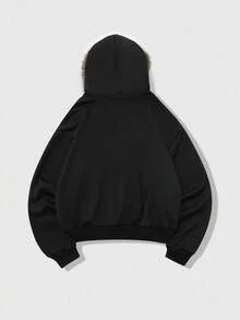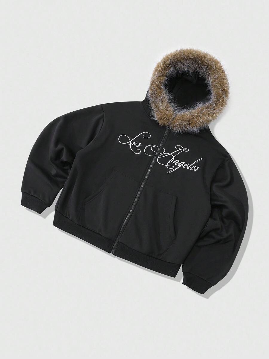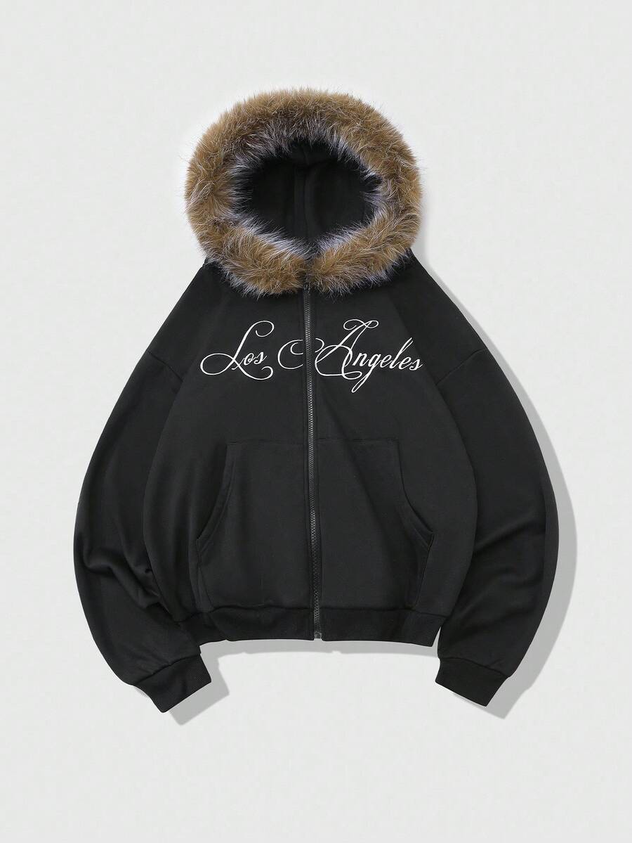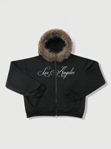 Street Life Men's Hooded Sweatshirt With Embroidered English Text And Fur Collar, Street Style, Fall Winter