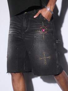 Street Life Men's Loose Cross Diamond Embellished Casual Denim Shorts