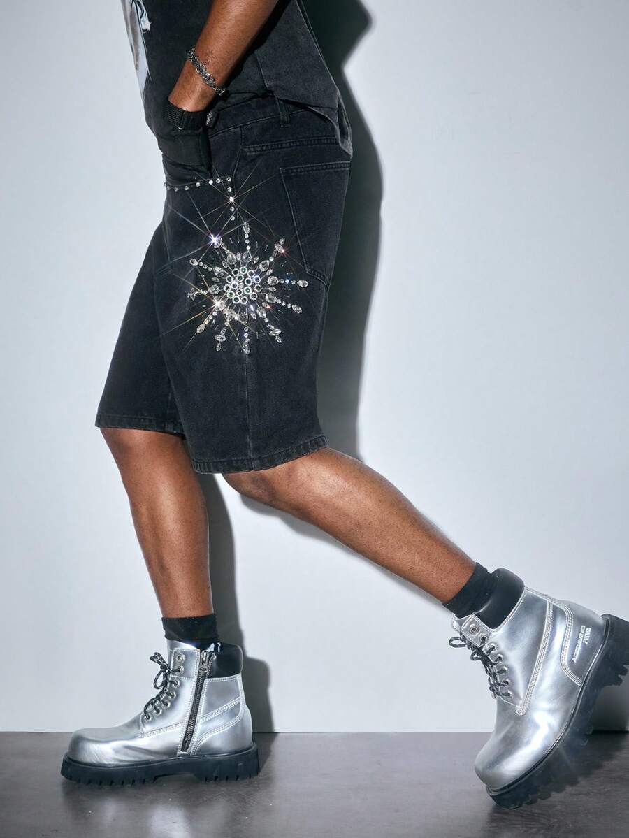 Men's Street Life Rhinestone Decor Pocket Wide Leg Loose Casual Denim Shorts