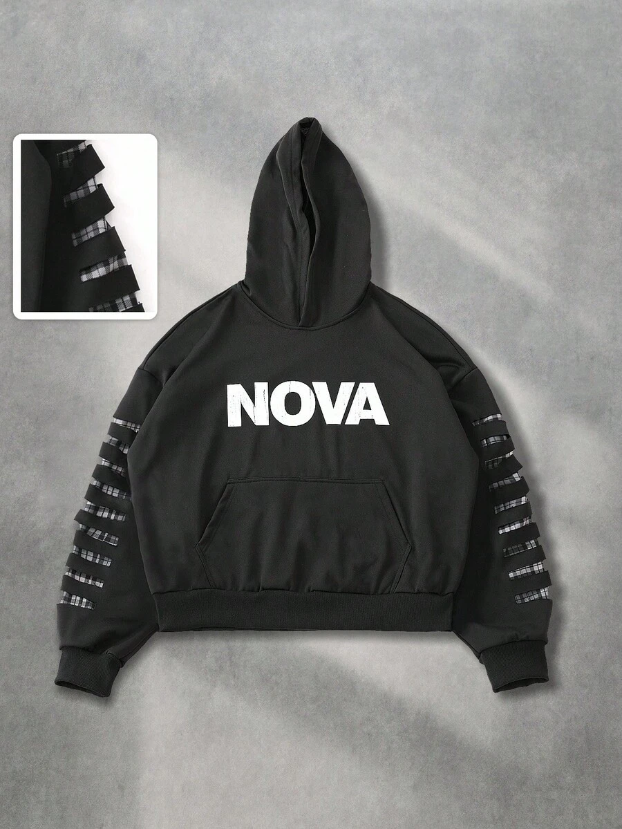 Street Life Men's Street Style Distressed Patchwork Plaid Hoodie, Loose Cropped Fit, Fall