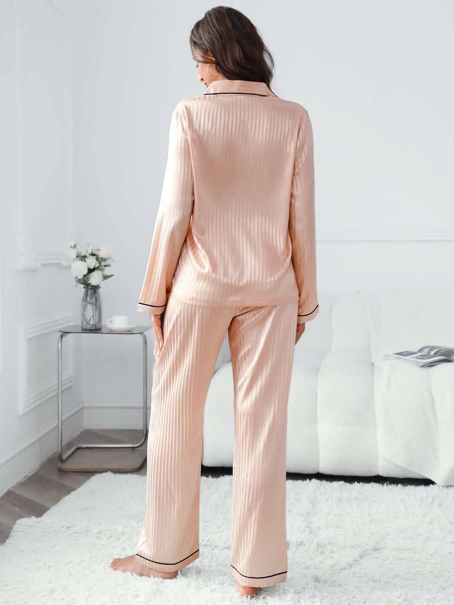 Striped Pocket Front Contrast Piping Satin PJ Set