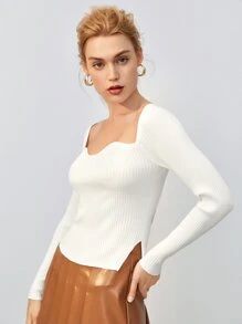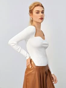 Sweetheart Neck Split Hem Ribbed Knit Jumper
