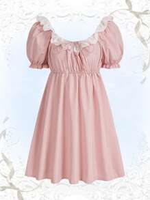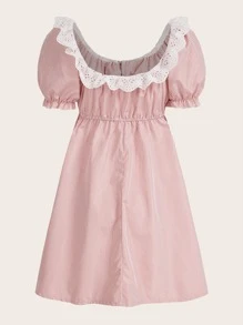 Gingham Contrast Eyelet Embroidery Puff Sleeve Dress