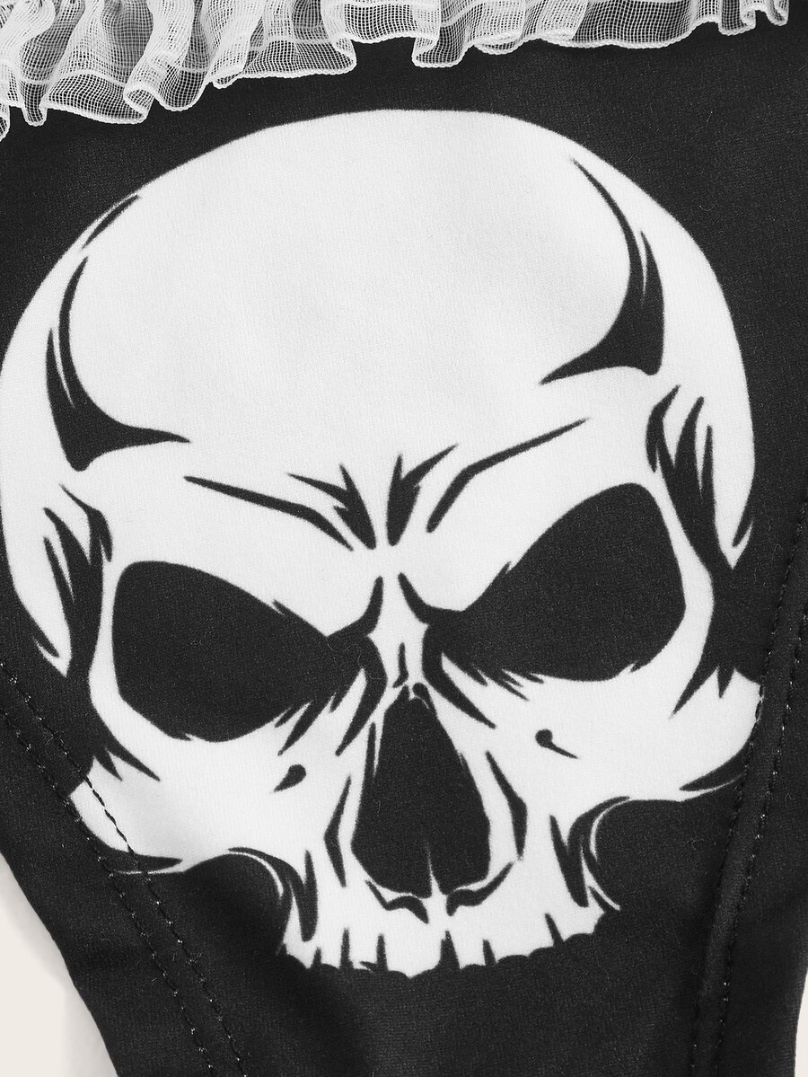 Grunge Punk Skull Print Contrast Mesh Lingerie Set