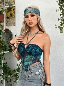 Tie Dye Bandana Hem Tie Backless Crop Mesh Halter Top