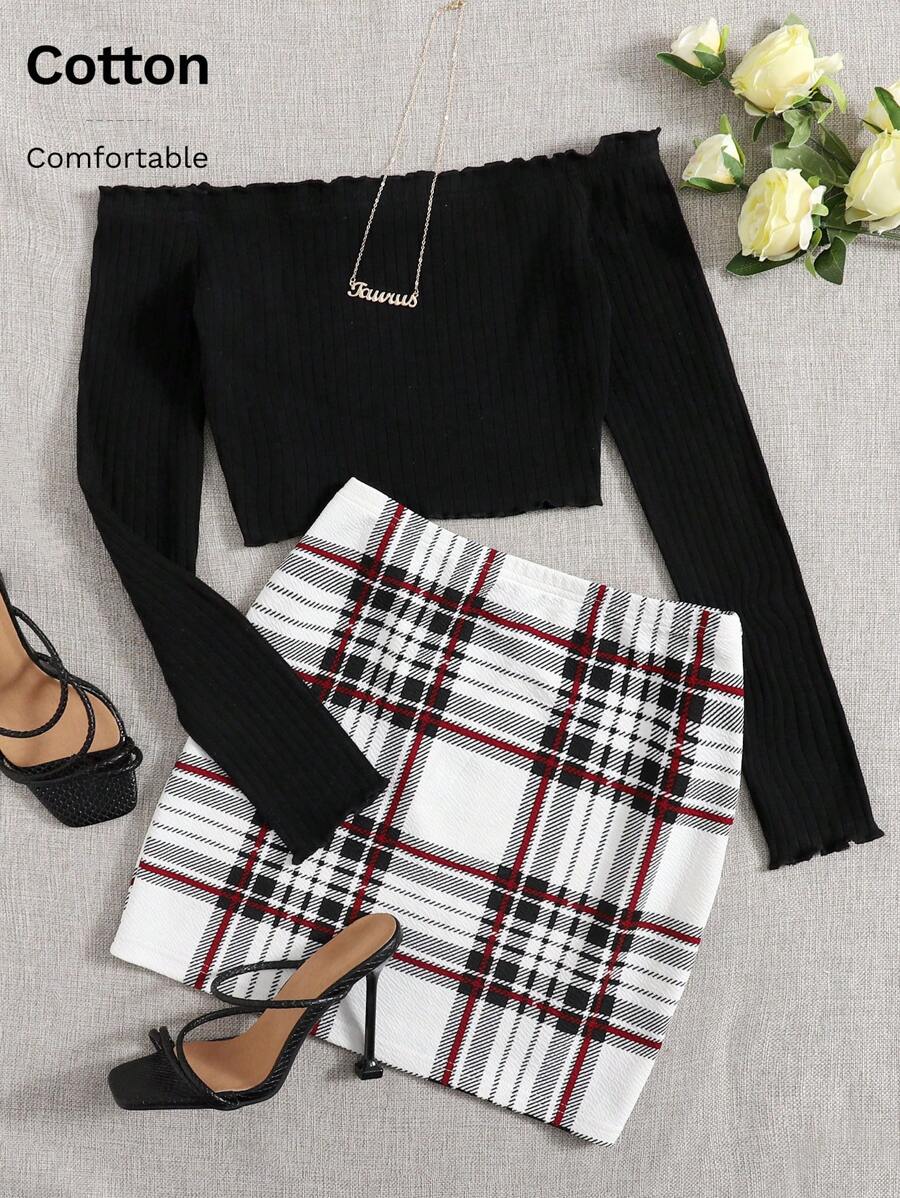 Two Piece Outfits Off Shoulder Lettuce Edge Tee And Tartan Skirt Set