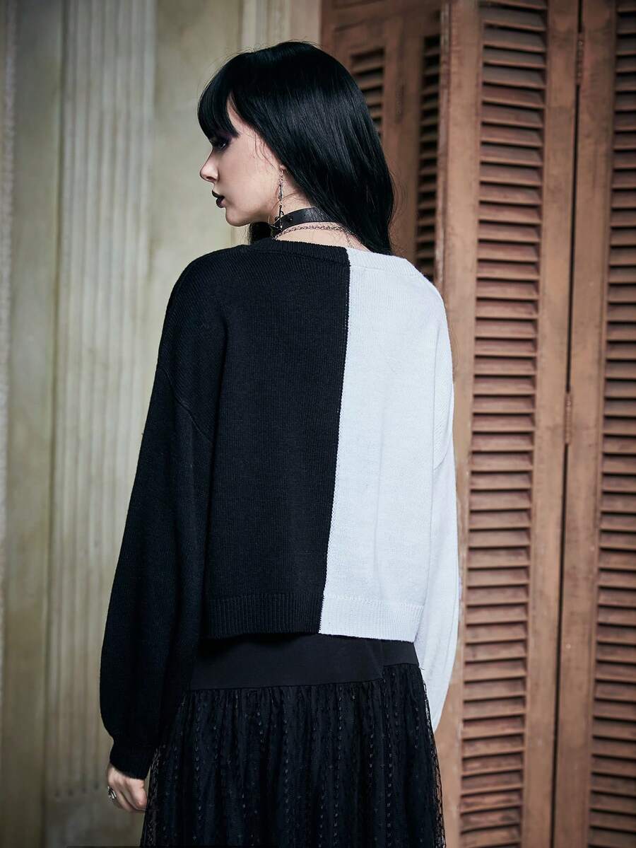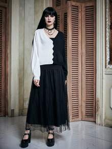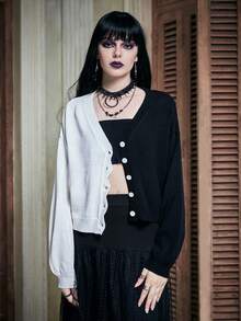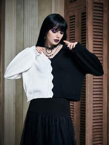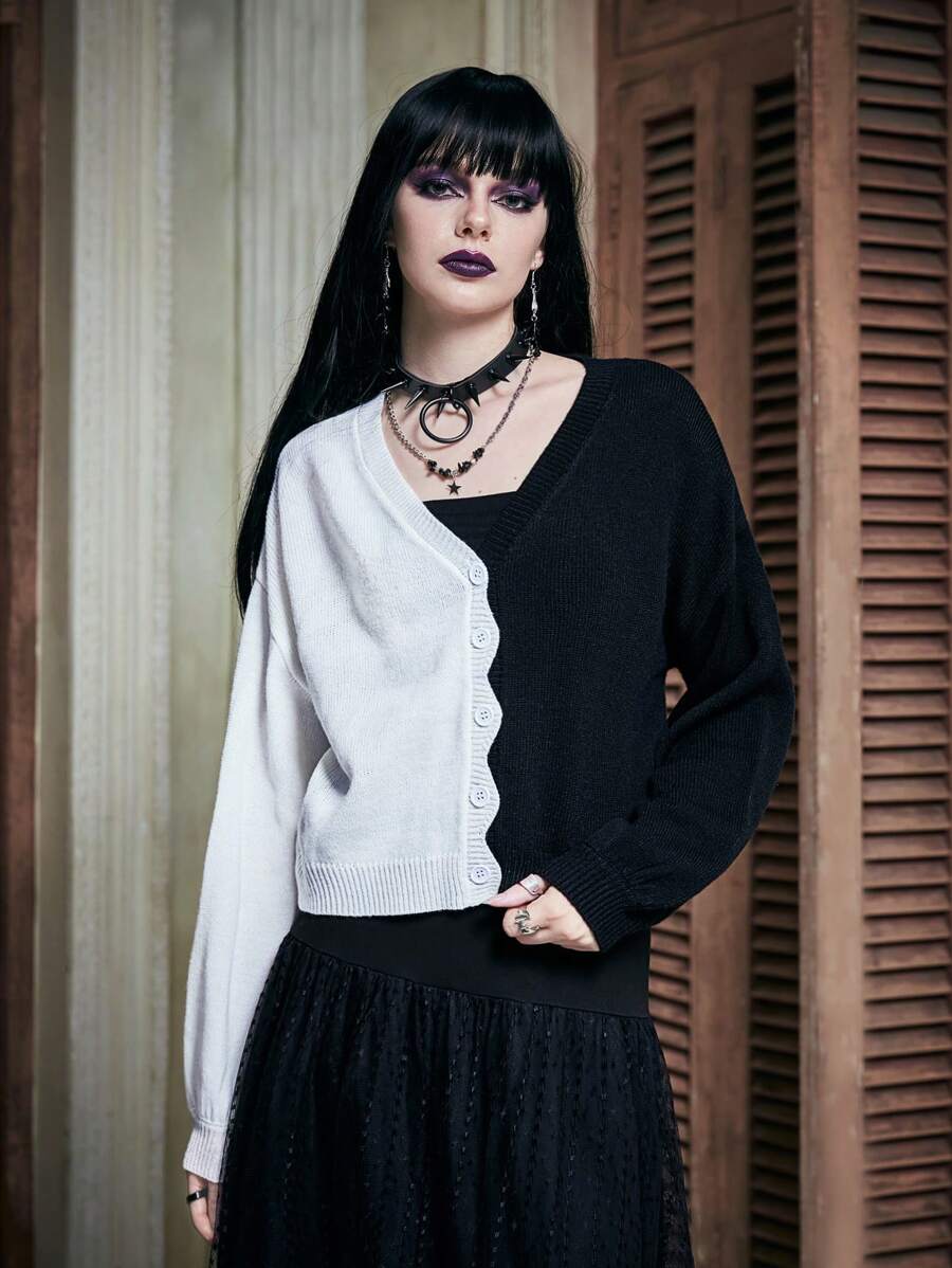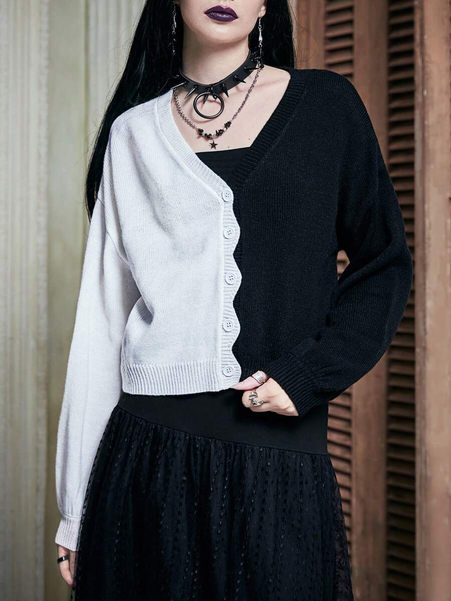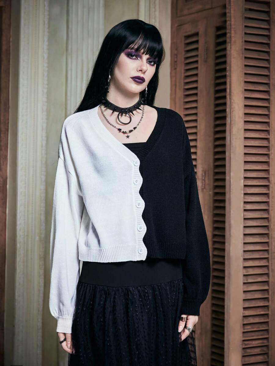 Two Tone Scallop Trim Drop Shoulder Cardigan
