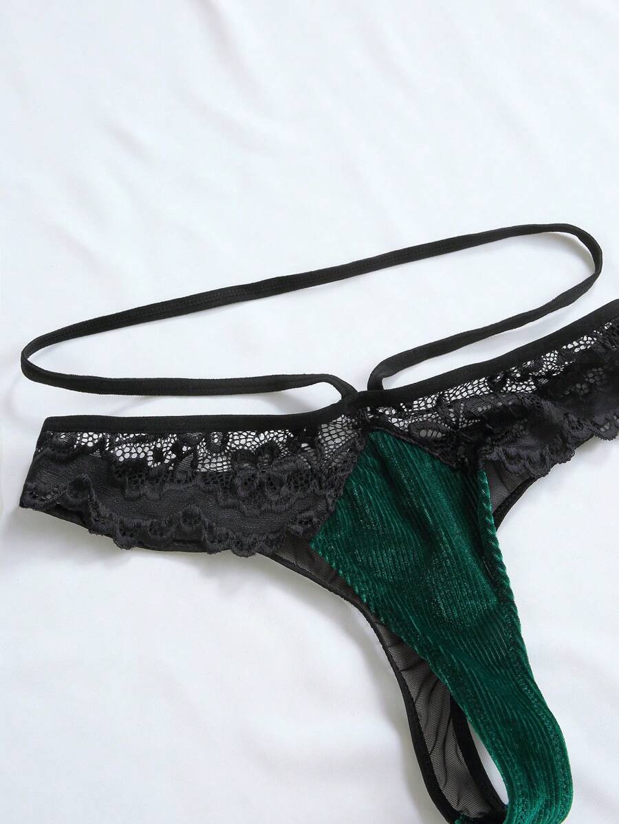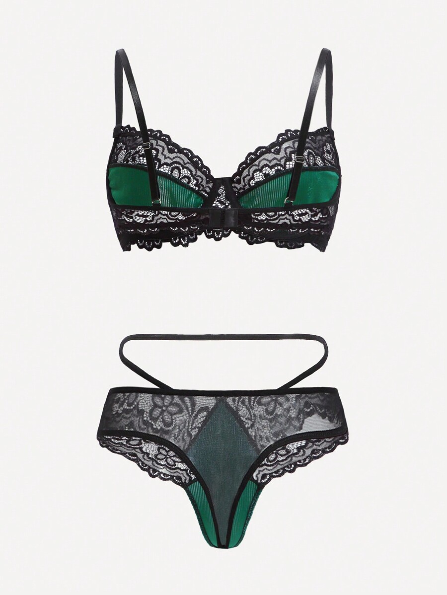 Velvet Contrast Lace Scallop Trim Underwire Bra & Panty Lingerie Set