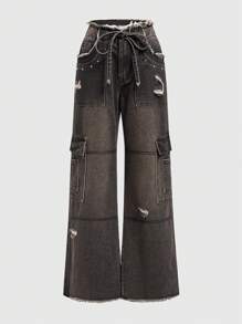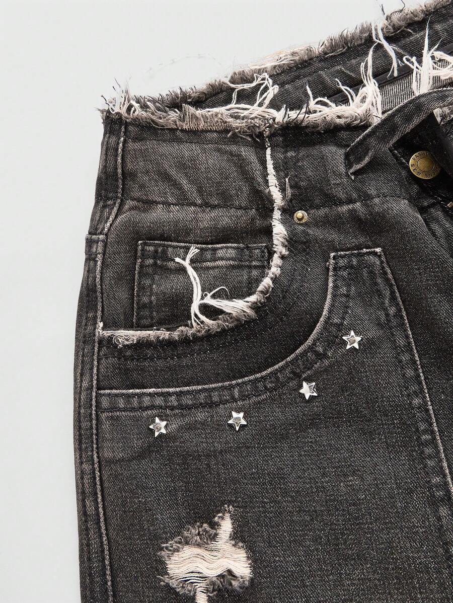 Grunge Punk Vintage Y2k Look Maillard Style Wide Leg Low Rise Distressed Jeans With Rivet & Fringed Hem, Rust Color
