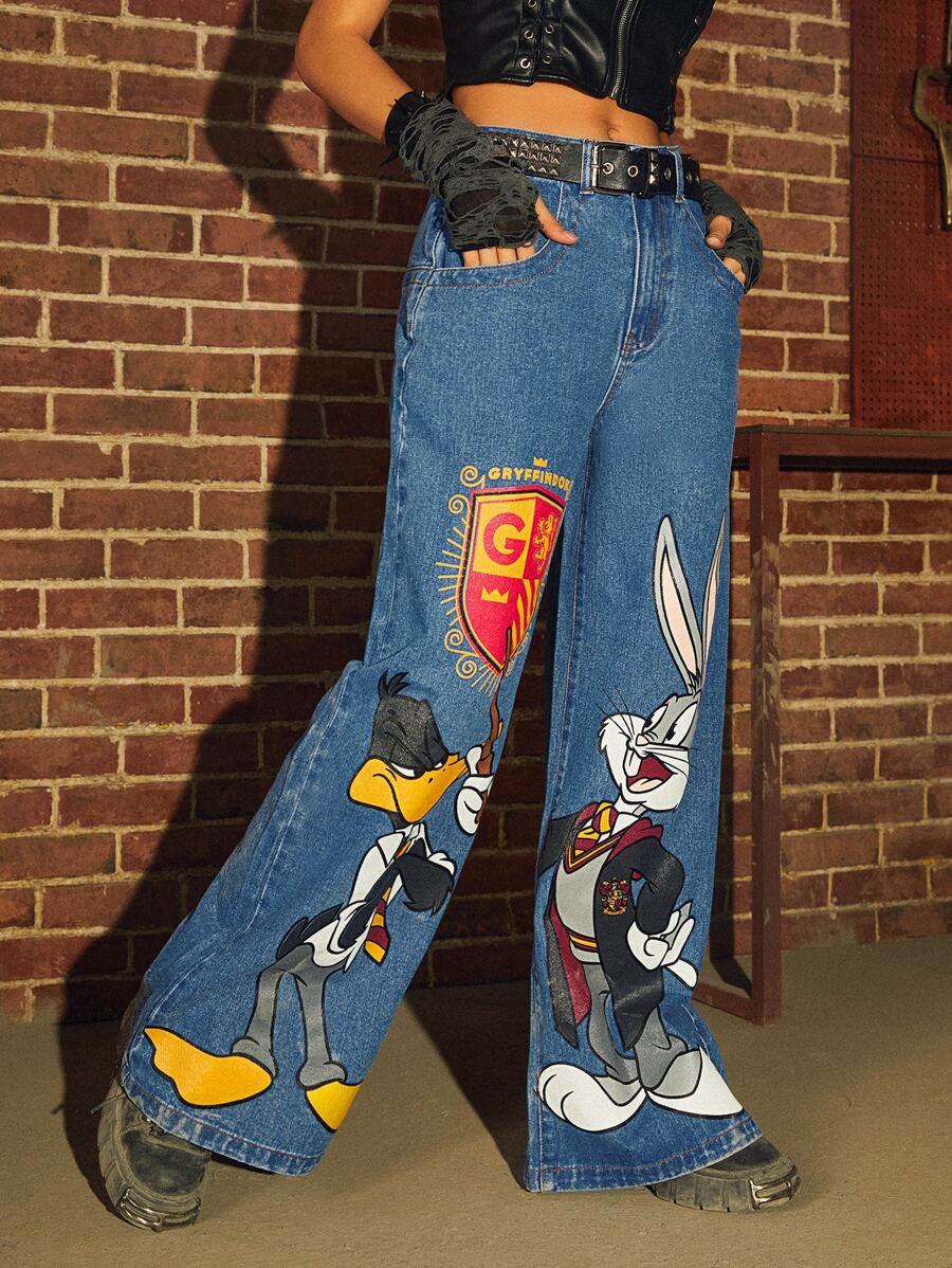 WB 100th | ROMWE Cartoon Graphic Wide Leg Jeans Without Belt