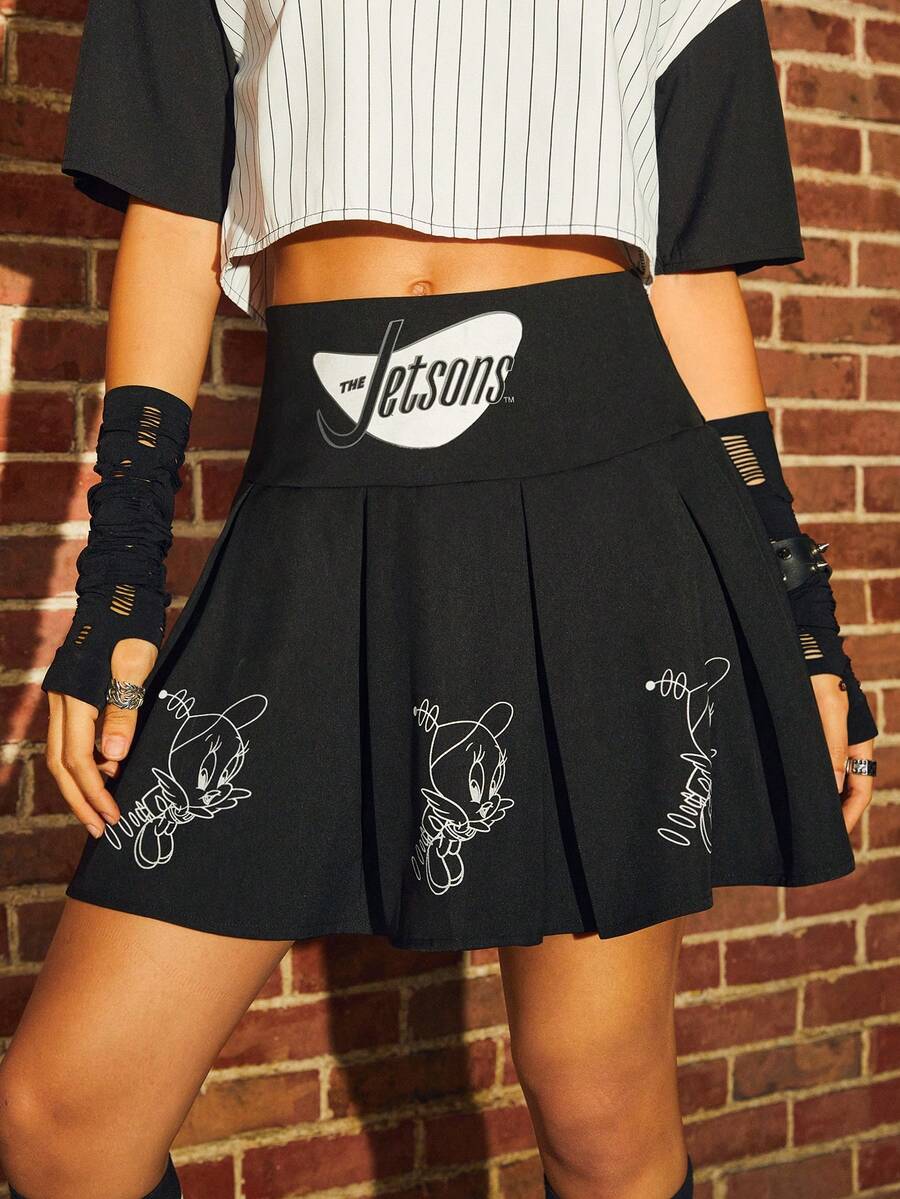 WB 100th | ROMWE Letter & Cartoon Graphic Pleated Skirt