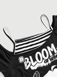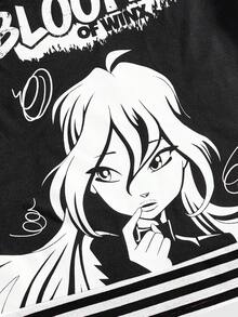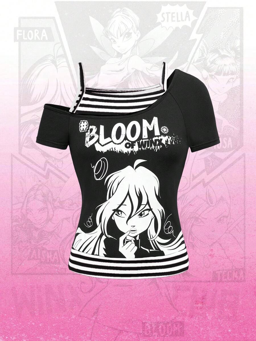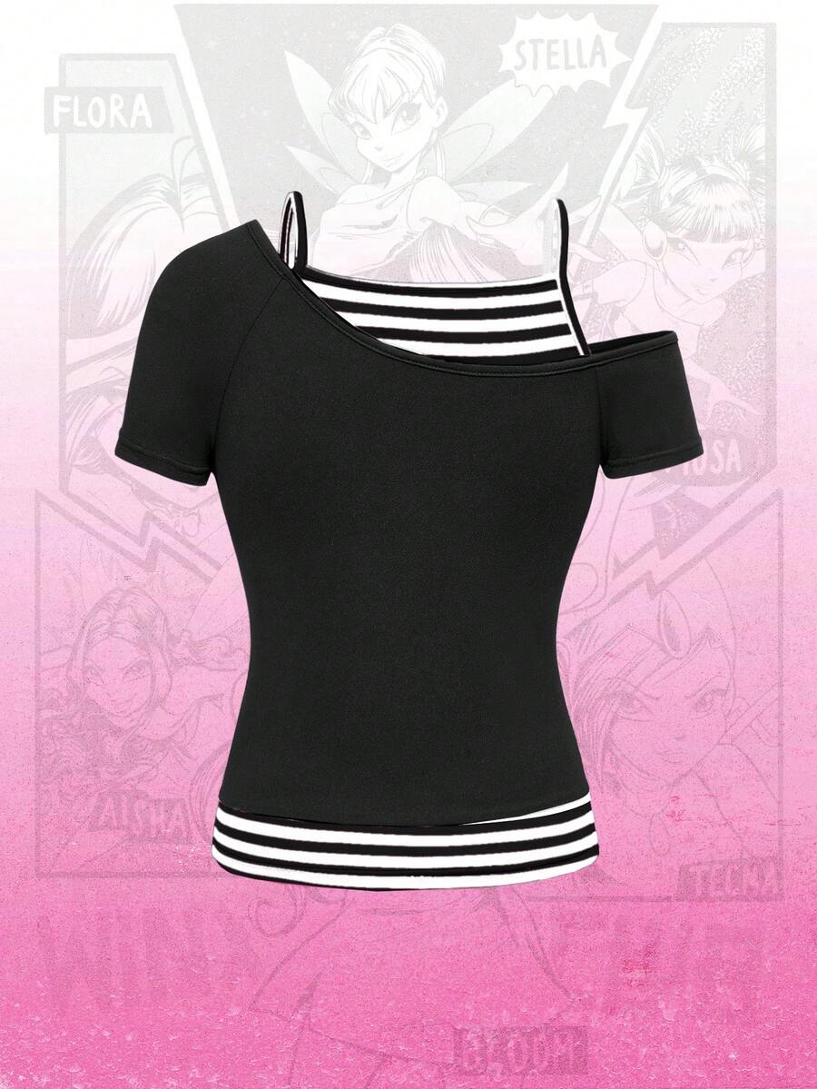 Winx Club X ROMWE Women's Faux Two-Piece Striped Portrait Pattern Asymmetric Shoulder Fitted T-Shirt