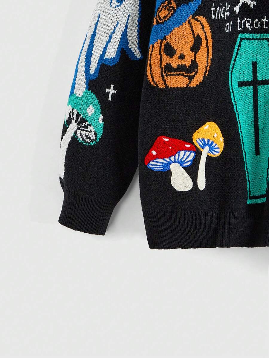 Goth Women's Halloween Pumpkin, Ghost & Bat Embroidered Loose Fit Cardigan Sweater For Daily Wear