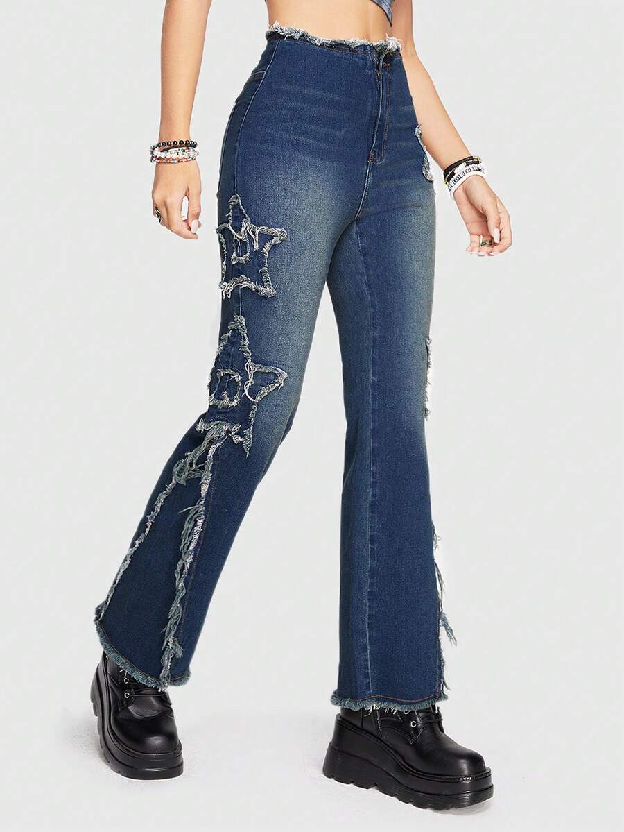 ROMWE Avant Women's Denim Jeans With Star Patches