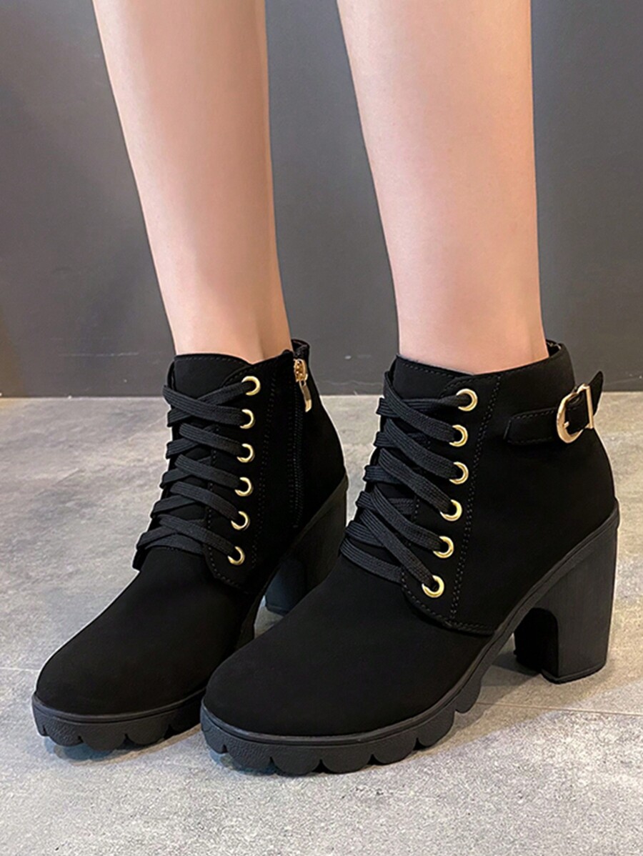 Women Buckle Decor Lace-up Front Chunky Heeled Boots, Cool Outdoor Fashion Boots