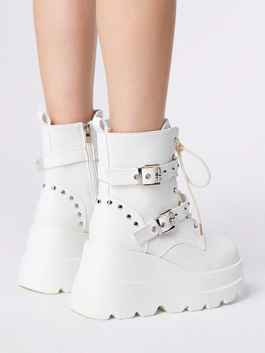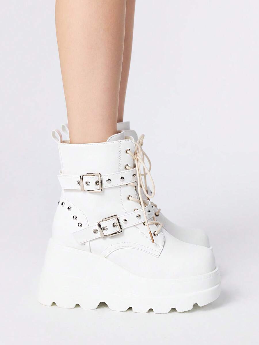 Women Gothic Punk Thick Platform Round Toe Ankle Boots With Grommets & Rivets, Black, Halloween