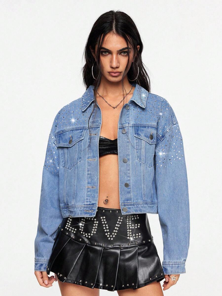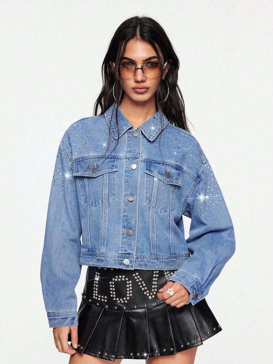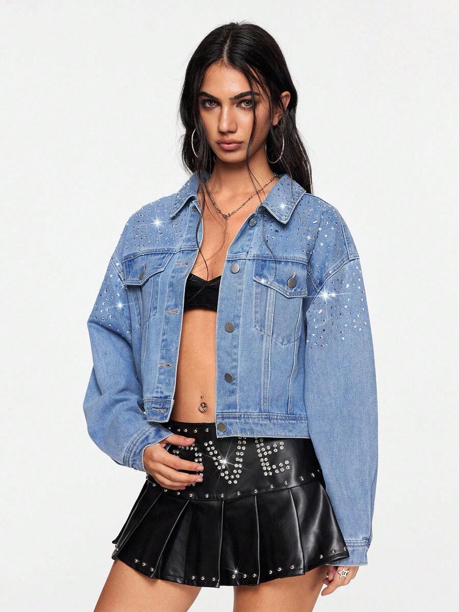 Women's Casual Fashion Rhinestone Embellished Drop Shoulder Loose Cropped Denim Jacket, Spring/Autumn