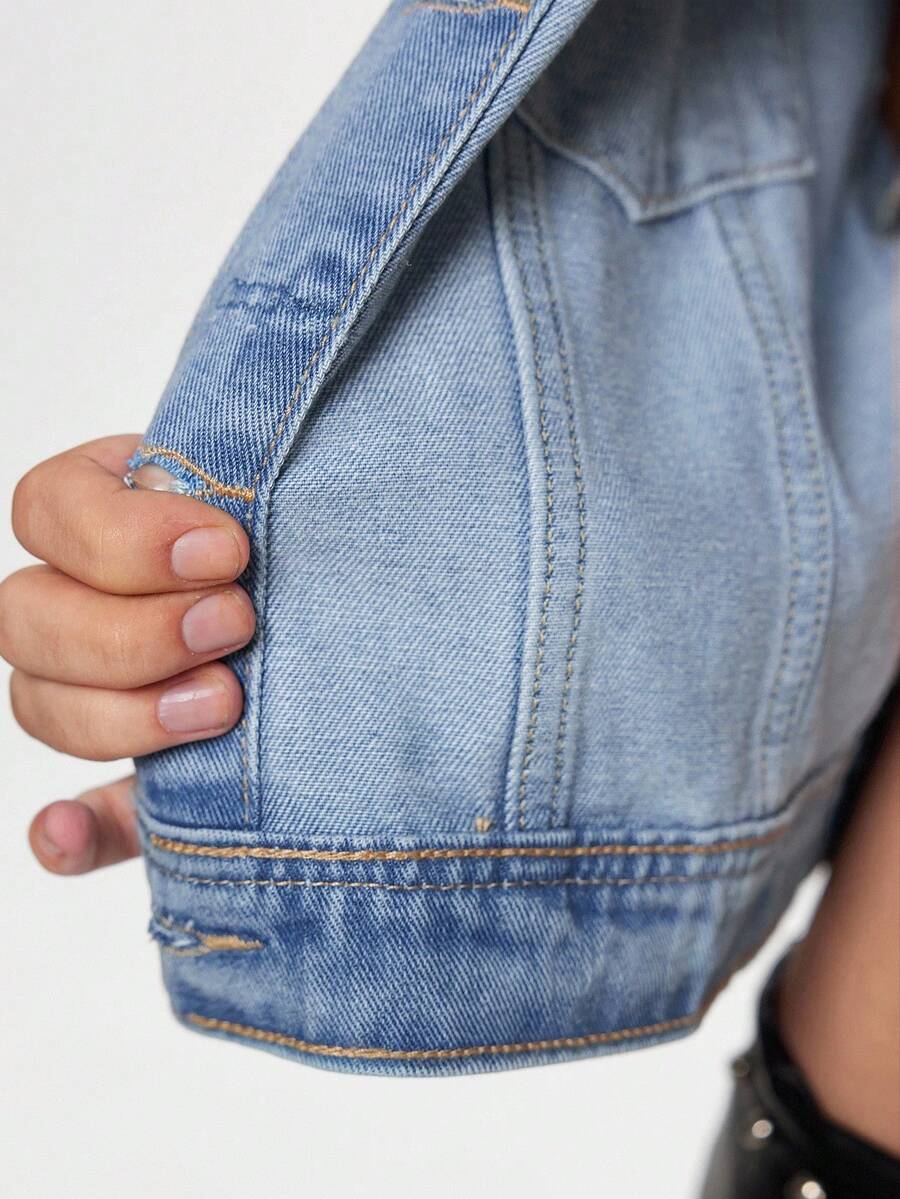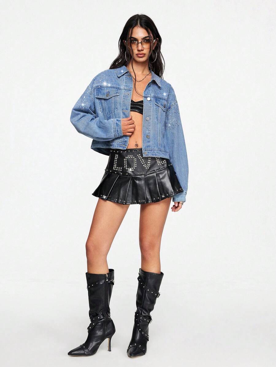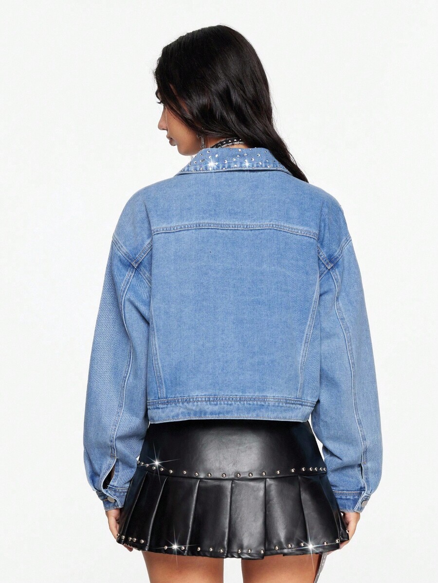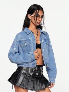 Women's Casual Fashion Rhinestone Embellished Drop Shoulder Loose Cropped Denim Jacket, Spring/Autumn