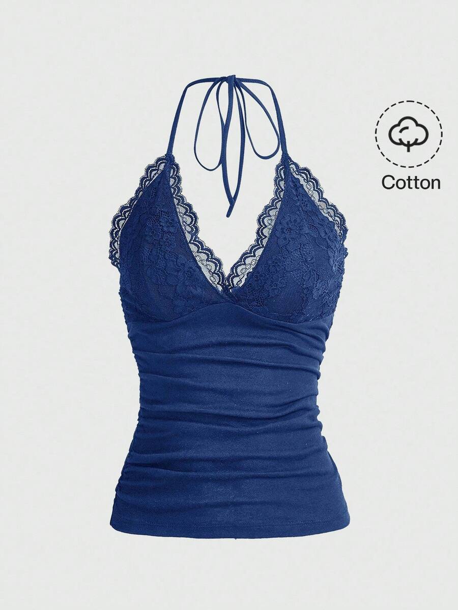 Women's Contrast Lace Ruffle Fitted Halter Neck Camisole