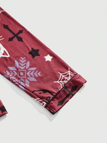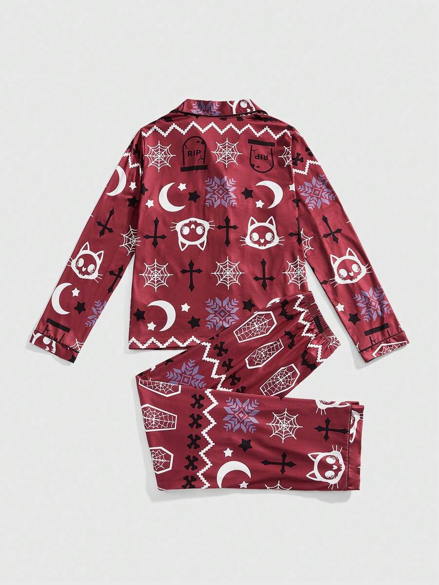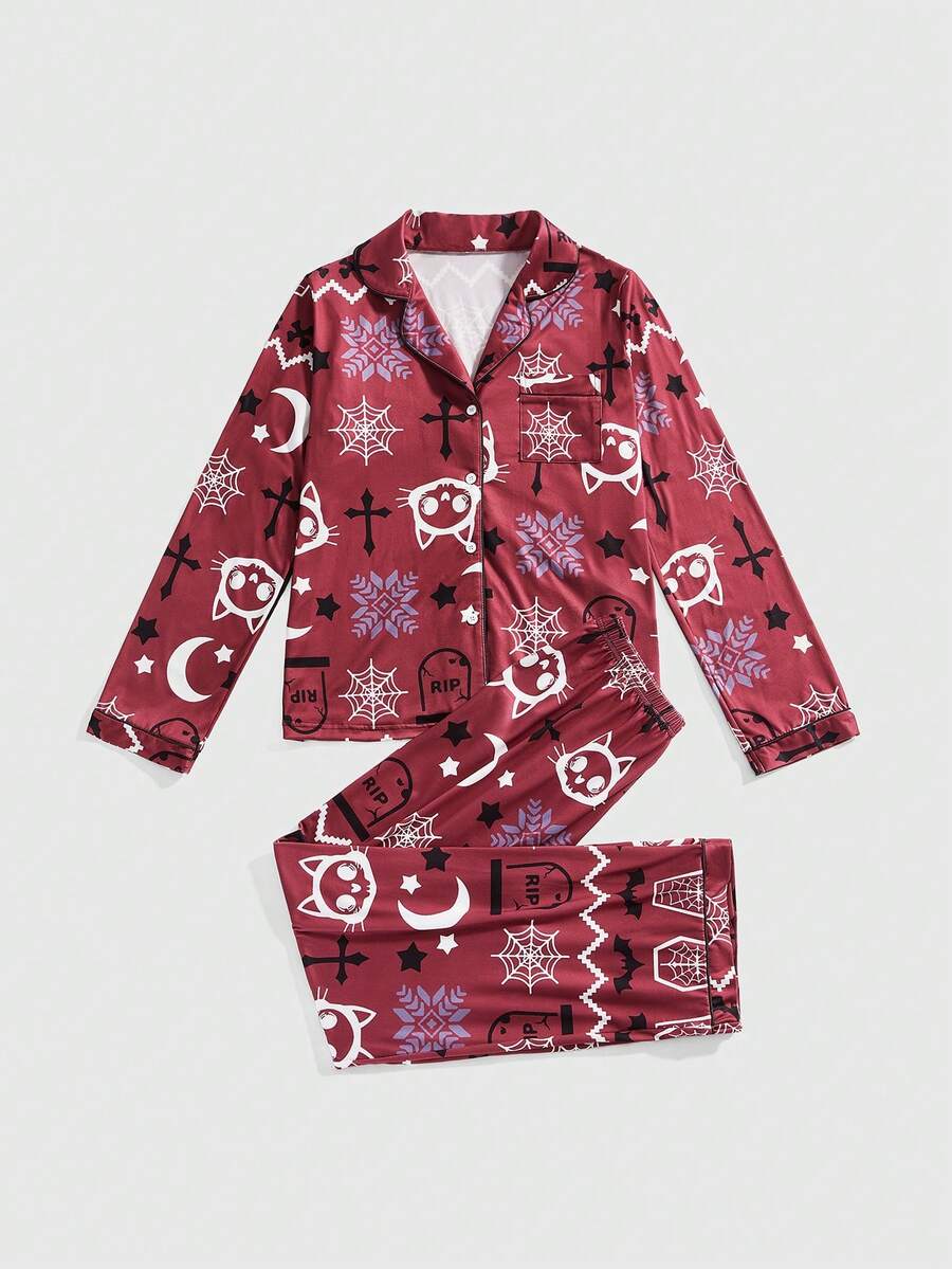 Women's Gothic Christmas Skeleton Deer Coffin Cobweb Snowflake Bat Cross Moon Bone Front Open Shirt Style Long Sleeve Pajama Set