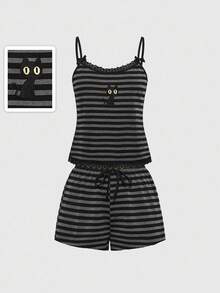 Women's Hippie Striped Lace Bow Camisole & Embroidered Black Cat Shorts Pajama Set