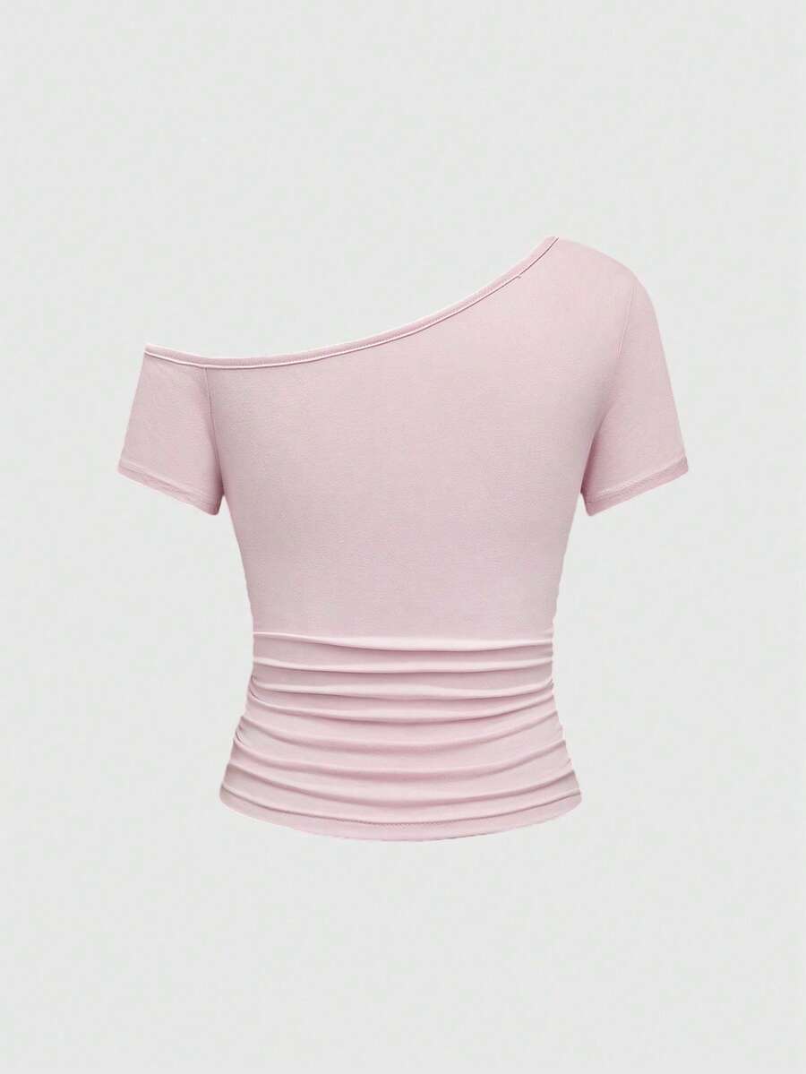 Women's Kpop Fashion Casual Rhinestone Heart & Letter Print Asymmetric Neck T-Shirt, For Carnival