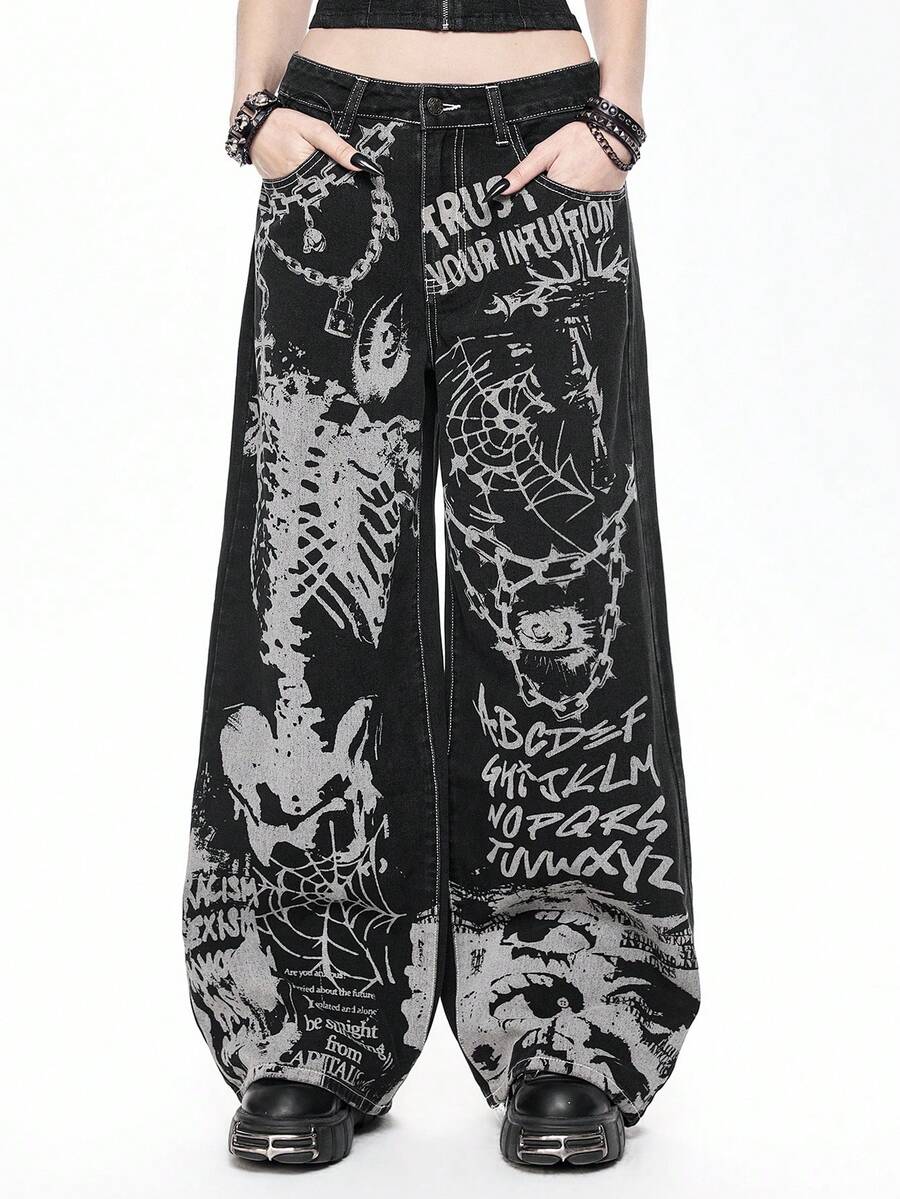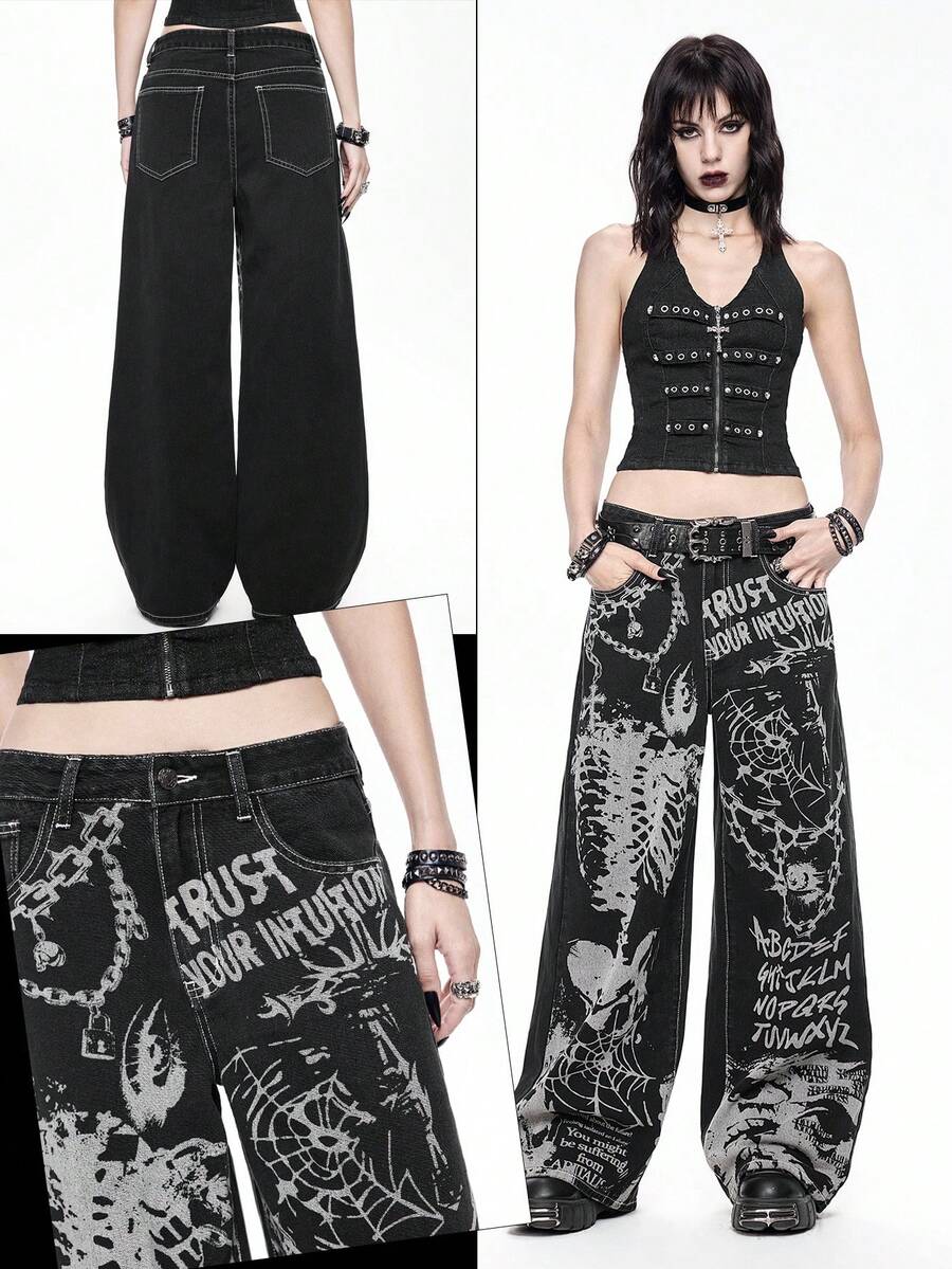 Women's Loose Fit Wide Leg Jeans With Punk Gothic Skeleton, Cross, Spider Web & Chain Print