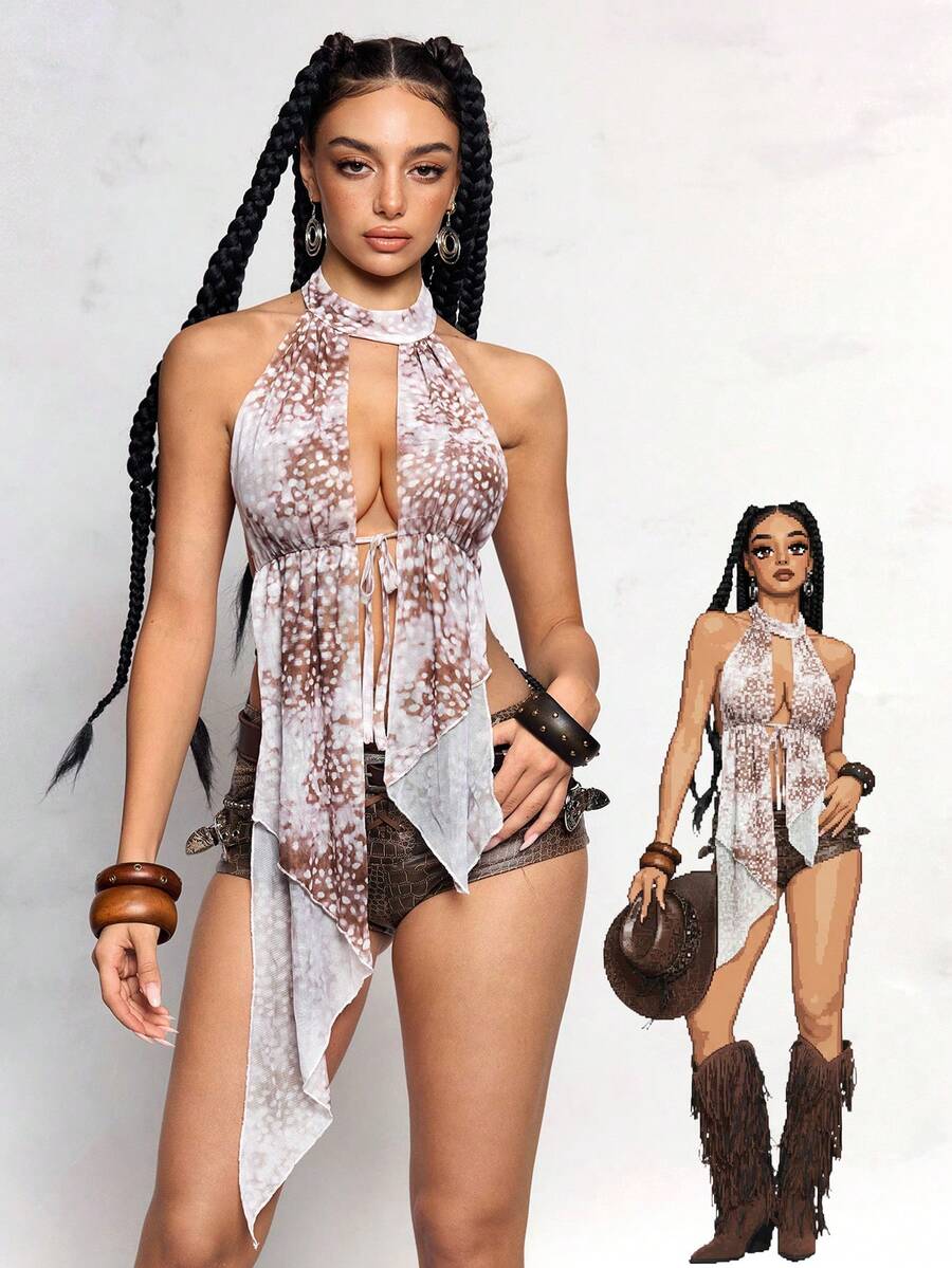 Women's Retro Rocker Hippie Music Festival Sexy Halter Asymmetrical Hem Sheer Strap Camisole
