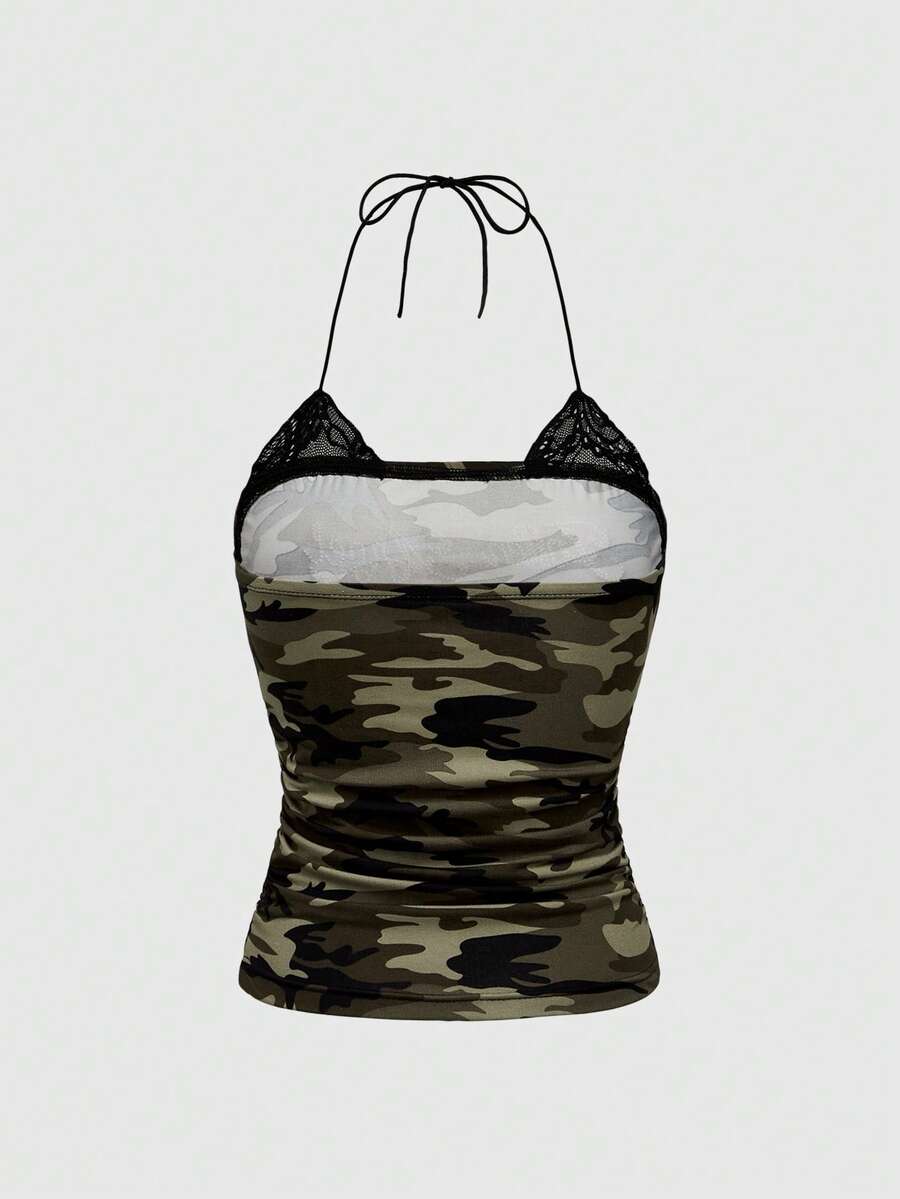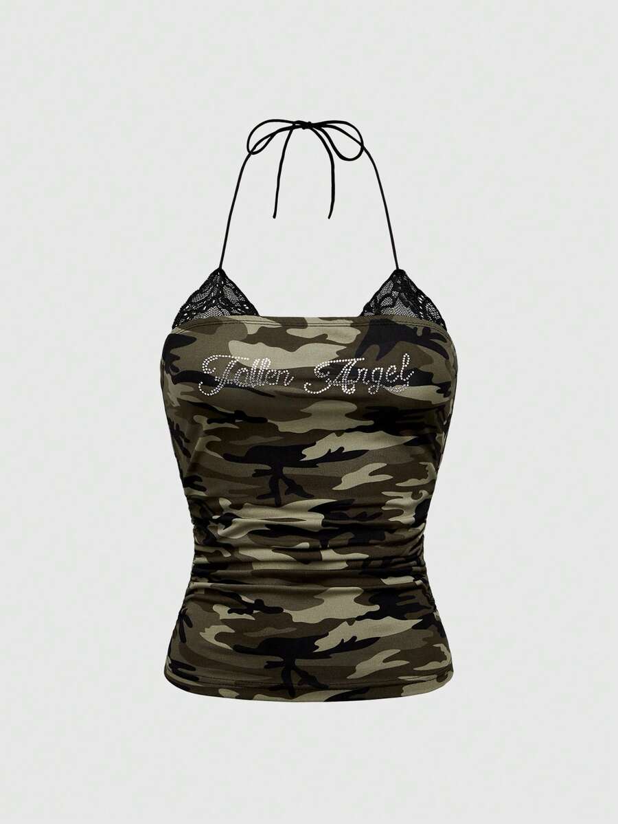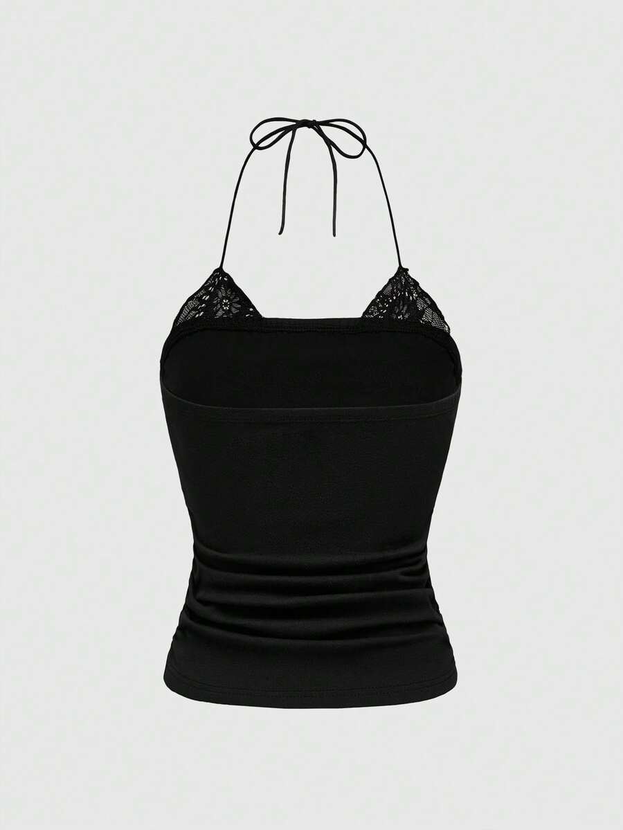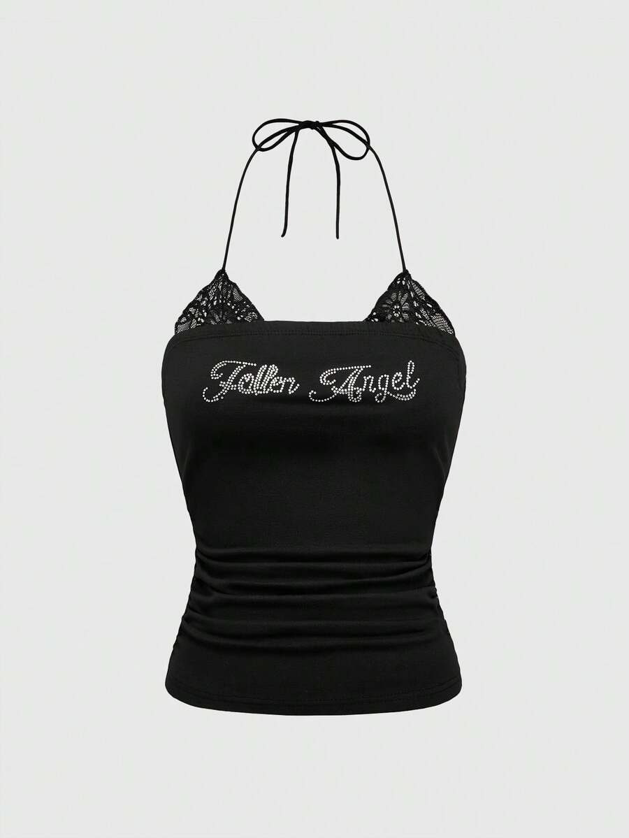 Women's Rhinestoned 2-In-1 Lace Trim Halter Ruched Tank Top Multitier Set