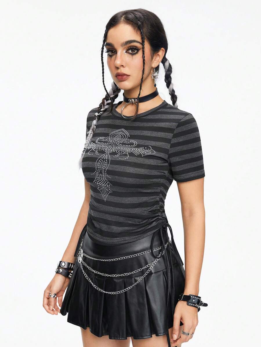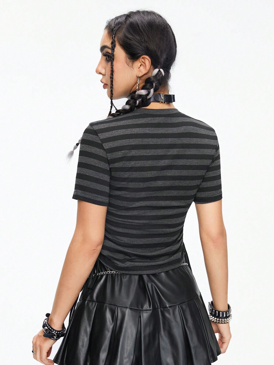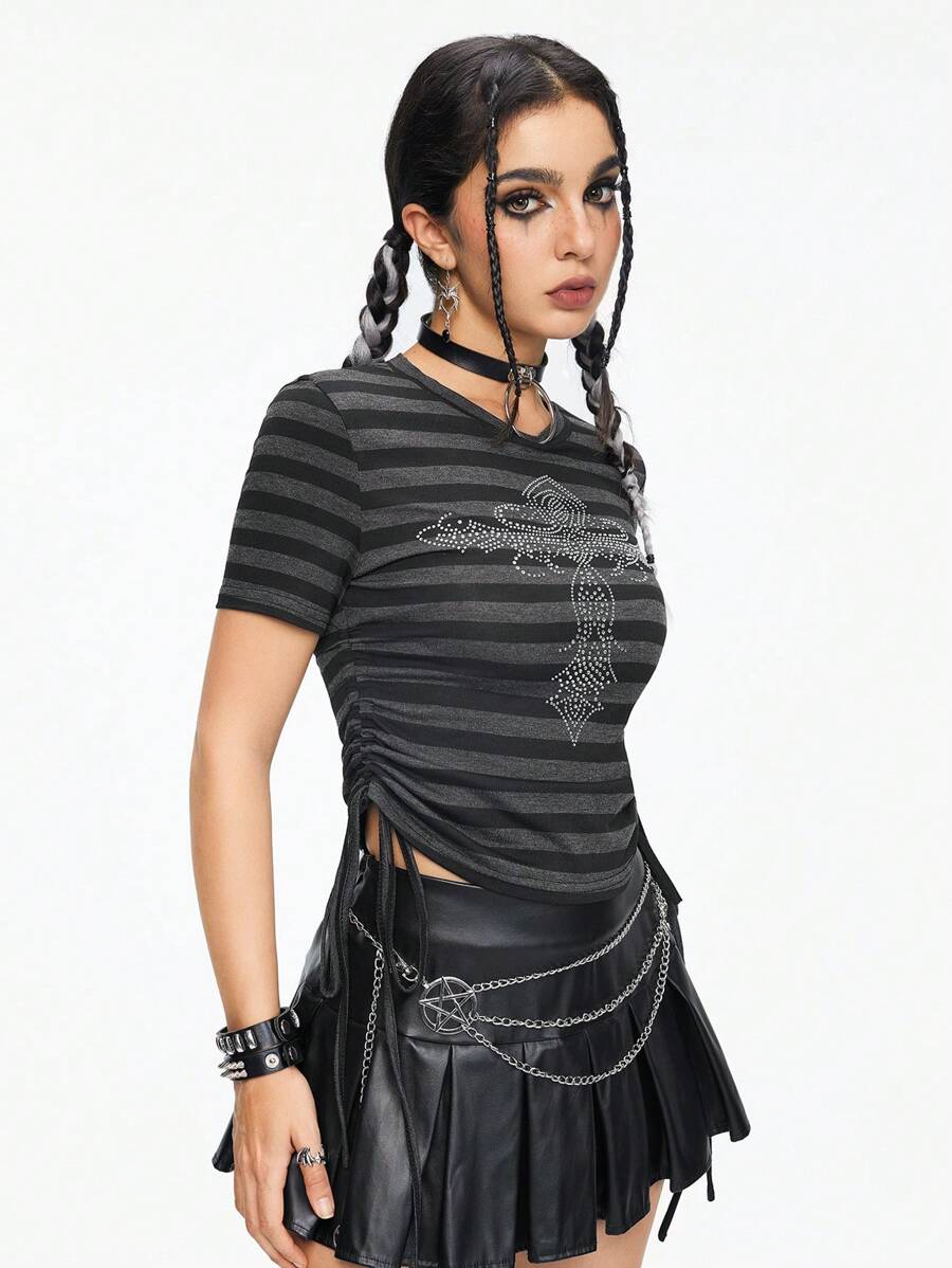 Women's Striped Cross Embellished Slim Fit Drawstring Round Neck T-Shirt
