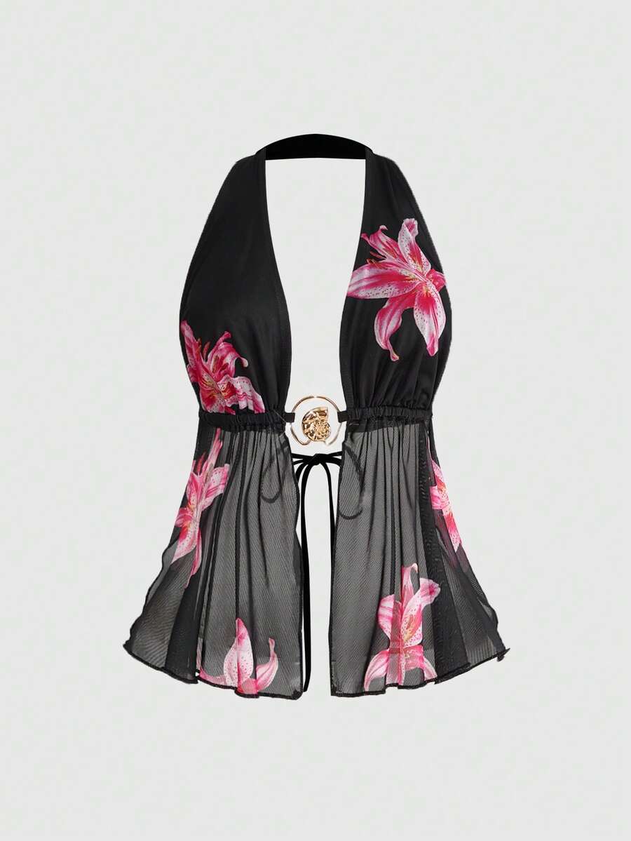 Y2K Island Girl Open Slit Halter Neck Tie Lily Flower Sexy Camisole